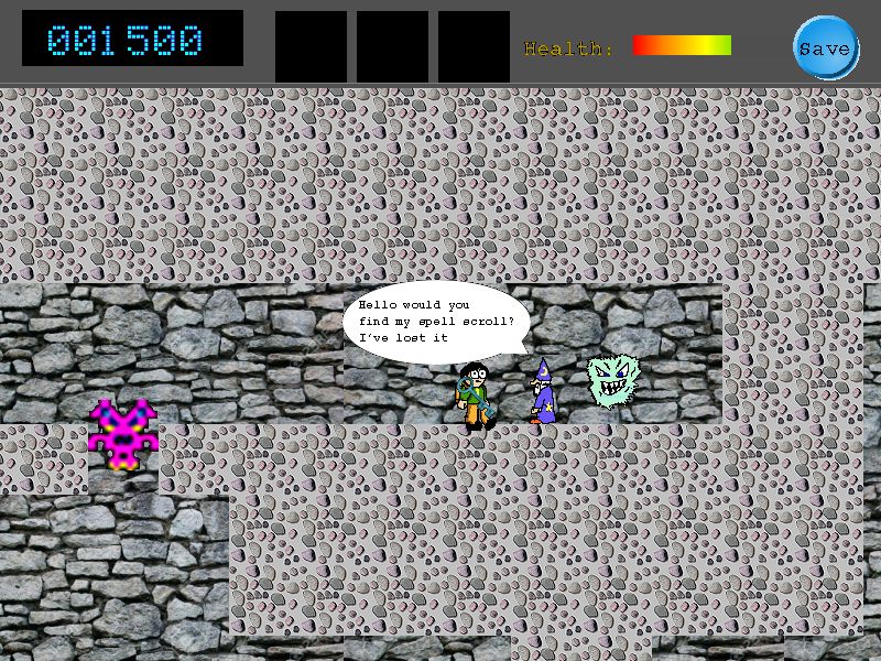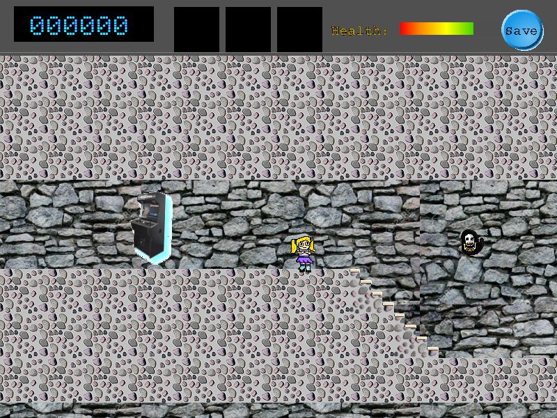 PlotThe arcade machine displays a warning sign and wiring hangs out precariously. You fiddle curiously with the controls and then feel a spinning sensation.When you awaken you can see ghostly figure floating toward you and feel the cold hard stoney floor pressing into you. You are trapped within the arcade machine due to a dimensional fault and must find a way out. Summary of Game PlayEscape from the Arcade is a new RISC OS arcade puzzle game developed using AMCOG Developent Kit.Within the game you can: