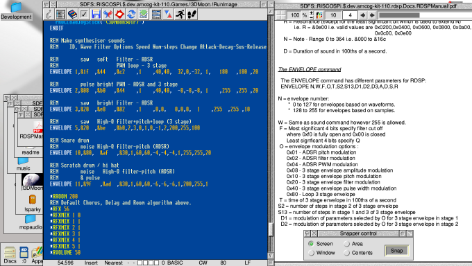 31st July 2023 : Development Kit UpdatesA development kit update is in development that will add some simple 3D routines.For a change I decided to compose music using RDSP and put this in a demo 3D Game called 3D Moon Base Attack You can listen to that track here: RDSP In-game music made using BASIC ENVELOPE commands